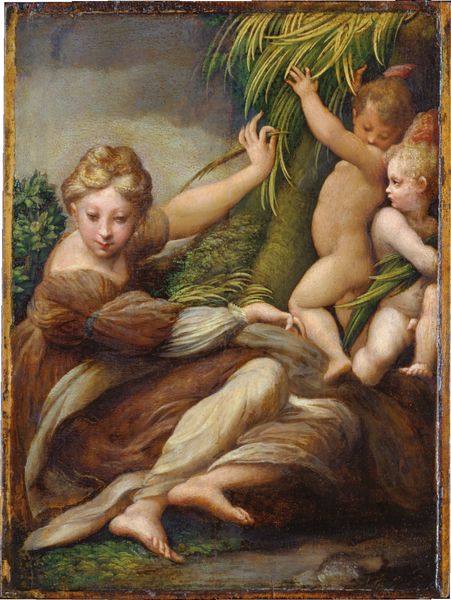 Parmigianino painted this small oil on panel, "Mystic Marriage of St Catherine", during the Italian Renaissance, a time of evolving views on religion, gender, and power. The painting depicts the common subject of the Mystical Marriage of Saint Catherine, a subject which speaks to the spiritual union of the Saint with Christ. However, Parmigianino departs from traditional depictions through his emphasis on intimacy and sensuality. The figures of Mary, Jesus, Catherine, and Joseph, are softened and imbued with an almost dreamlike quality. Catherine, kneeling and partially unclothed, is about to receive a ring from the infant Jesus, a symbol of their mystical union. The gazes are gentle, the touches delicate, and the emotional atmosphere hushed. Parmigianino’s work reflects a shift in artistic and cultural values, reflecting the artist's personal exploration of faith and devotion while subtly challenging the established norms of religious art, inviting viewers to contemplate the intersections of spirituality, love, and human experience.