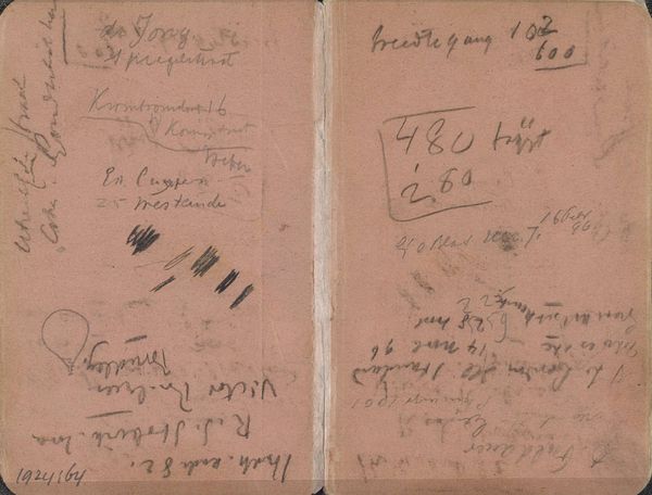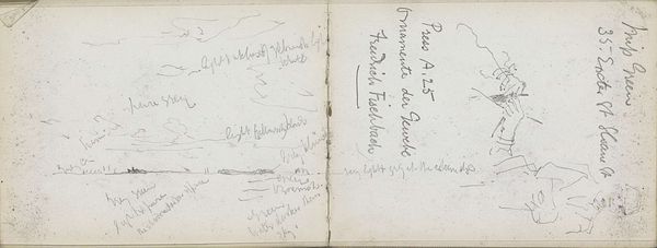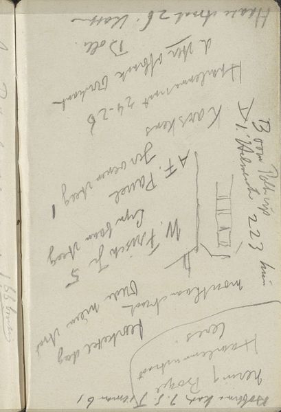 Curator: Here we have “Notities,” which translates to “Notes.” It’s a mixed-media drawing on paper, incorporating ink and pencil, dating from between 1906 and 1945. It is currently held in the Rijksmuseum collection. Editor: Oh, it's like stumbling upon a beautifully cluttered mind! I immediately get a feeling of intimacy, seeing these almost whispered thoughts jotted down. The different pressures of the pencils, that pale blue ink—you can almost feel the artist’s hand moving across the page, lost in thought. Curator: The intimacy you feel is apt. We believe this is a page from an artist’s sketchbook. Consider that it contains various notations: addresses, names – “Leidse Rijnkaade 25,” “Carpaccio 1490-1522” and little sketched elements, reflecting daily life, artistic concepts, potential projects – really fragments of the creator's world. The Rijksmuseum treats such personal artefacts with exceptional reverence, understanding their important contribution to art history as a whole. Editor: It’s wild how such an ordinary thing, a discarded piece of ephemera, offers a tantalizing look behind the curtain. You sense a creative life in progress – not something polished and presented, but messy, real. I find this rawness far more appealing than many finished works. It whispers “process”. Curator: Exactly, and I appreciate how it reflects shifts in the cultural perception of art. Before, the finished work was the ultimate aim, obscuring the origins and processes which went into them. The art world increasingly cherishes insight into an artist’s methods of enquiry. Sketchbooks are primary sources of insight in understanding not only the single artist but, indeed, cultural development more broadly. Editor: You know, looking closer, the mix of text and graphite smudges almost resembles a constellation. It’s as though thoughts themselves are trying to find a pattern, trying to resolve into a coherent whole. What was going through the creator's mind at that time? I just find it intriguing. Curator: The beauty is we’ll probably never know for sure, but this snapshot of an evolving creative landscape sparks countless stories, theories, speculations…It certainly humanizes artistic practice. Editor: Absolutely, I leave this artwork feeling strangely nourished and curiously energized. A conversation with someone I've never met! Curator: Yes, it prompts a reflective look at the social contexts of art appreciation, highlighting our increasingly granular understanding.
