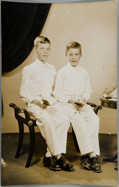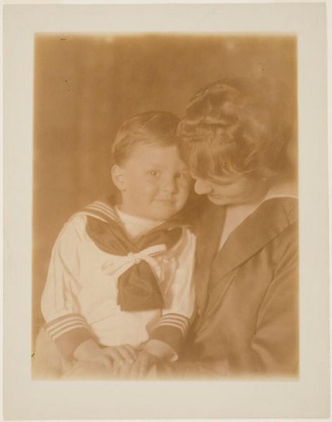 Editor: Here we have Sarah Choate Sears' photograph, "Montgomery Sears Bradley and Cameron Bradley." It's a touching sepia-toned image, full of a gentle nostalgia. What catches your eye in this work? Curator: For me, it’s the vulnerability. Sears, a woman of her time capturing two children, likely relatives. It’s more than just a snapshot, wouldn't you agree? The boys' embrace speaks volumes, doesn't it? Editor: Definitely! It's interesting to consider the photographer's perspective too. How does knowing it was a woman photographing children change our view? Curator: Ah, exactly! Perhaps it's the quiet intimacy, a mother's gaze, maybe. The sepia tones just amplify that timeless feeling. And the way the light softly embraces them...makes you wonder, doesn't it? Editor: I hadn't thought about it that way. Thanks! Curator: My pleasure.
