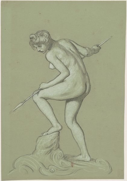 Editor: This drawing, "Girl Spearing Dolphin," is from around 1900 by Elihu Vedder, done with pencil and charcoal. The figure seems really dynamic, almost caught mid-motion. How do you interpret the composition here? Curator: The dynamism emerges precisely from Vedder's acute attention to formal elements. Consider the diagonal thrust of the spear, countered by the curve of the figure's back and the angle of her gaze. This creates a palpable tension, a visual push-and-pull that animates the entire scene. Observe how the artist uses chiaroscuro to model the figure, lending sculptural weight and volume. Editor: So the focus is less on what she's doing and more on how the lines and light interact? Curator: Precisely. One can appreciate the artist’s attention to anatomical detail while at the same time considering that detail in terms of formal arrangement, and the expressive weight carried in different marks of the medium. Editor: That makes sense. I was trying to understand the story, but it's more about the artistic technique itself. Curator: Technique is a form of argument, here. Vedder employs established methods of the academic tradition in an attempt to invest form with meaning. This requires us to carefully assess the elements within the frame and their connection to other shapes, colors and figures within. How does she relate to that dolphin, after all? Editor: It’s a really different way to look at it than I’m used to, but it does open up new ideas. Thanks for pointing out the tension created by the lines. Curator: The artist’s formal strategy is a conversation with a lineage and not merely a representational effort, as we are reminded through subtle tonal gradations. I’m glad to share these insights with you.