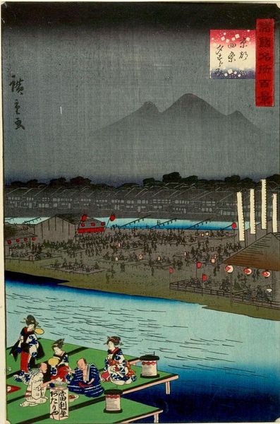 Editor: This print by Utagawa Yoshiiku captures a lively festival scene. All these figures packed together give a real sense of the energy. How do you interpret this bustling image? Curator: This print offers a glimpse into the social life of Edo-period Japan. The Niwaka festival, set in the Yoshiwara pleasure district, highlights the intersection of entertainment and commerce. Notice the red lanterns and banners. How do you think those visual elements impacted the cultural significance of the event? Editor: I guess they would reinforce the festival atmosphere, marking it as a distinct and important event. Curator: Exactly! Prints like this served as a form of social documentation, reflecting and shaping public perception of these events. It's fascinating how art can play such a role. Editor: Definitely, seeing it as a historical snapshot changes everything.