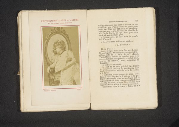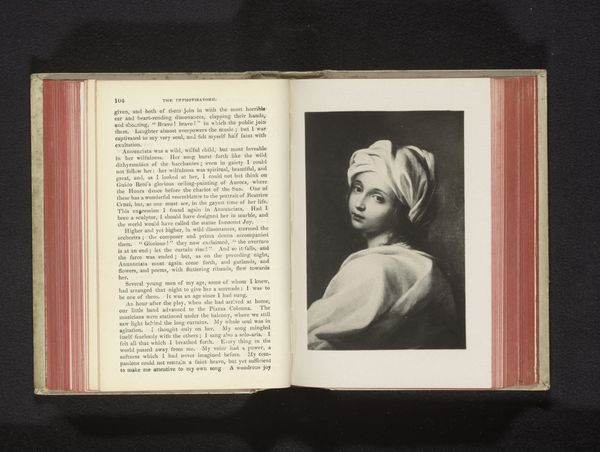 Curator: I’m immediately struck by the contrast in this gelatin silver print—the soft, almost dreamlike quality alongside what seems to be immense sadness in the subject's gaze. Editor: Indeed. Here we have a photographic reproduction of a portrait of Beatrice Cenci, its attribution tentatively given to either Guido Reni or Elisabetta Sirani, and created at some point before 1860. It's currently housed right here at the Rijksmuseum. Curator: Cenci. Even the name itself carries a weight, a historical baggage. To encounter her image, filtered through photographic reproduction within what looks like the pages of a book, creates this layered experience. We’re distant, yet somehow closer to her perceived inner state. Editor: Precisely. The image's presence in this form allows for a dialogue with its history. The tragic narrative surrounding Beatrice – a young woman executed for her father’s murder – has always captivated the public imagination. Consider how Romanticism amplified these stories, transforming her into a potent symbol of victimhood and injustice. Curator: Absolutely, and it's fascinating how the technical execution in the print, all those soft edges, supports that romantic sensibility, almost glorifying victimhood by positioning Beatrice as passive. What is her agency here? What does it mean for photography, a relatively new medium then, to recirculate such a loaded image? Editor: This particular print invites scrutiny into the mechanics of image distribution, its impact on public sentiment. Consider that mass-produced images served very explicit ideological roles during this era; to what extent does that function contribute to and dilute the original symbolic intention of that portrait. Curator: It’s less about Beatrice Cenci as an individual then, perhaps, and more about what Beatrice as an image represented. A cautionary tale against patriarchy? An exotic romantic martyr? Seeing it displayed as it is here in the book invites all those questions, particularly now as a woman's control over her body and fate is again being contested. Editor: Right. This image acts as a point of departure for broader socio-political inquiries into visual representation. The image isn't a definitive conclusion, rather an avenue to pursue discourse surrounding these loaded topics. Curator: A somber yet compelling starting point to re-evaluate how women, and their narratives, are treated historically. Editor: And how their images are endlessly reworked to suit various agendas across time.