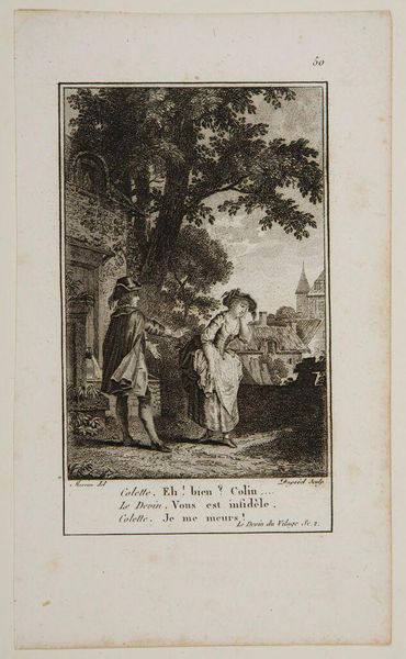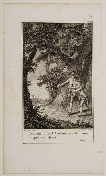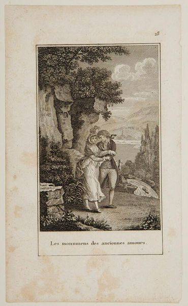 Curator: This is an engraving by Jean Baptiste Michel Dupréel, titled "It was at one of these moment of tenderness that I said to M. de Luxembourg . . .," currently held at the Harvard Art Museums. Editor: It strikes me immediately as a rather tender, intimate scene. The landscape in the background feels secondary to the embrace itself. Curator: Indeed. The embrace is central, echoing themes of affection and perhaps political alliance in the late 18th century. Homosocial bonds held significant weight. Editor: Note how the artist employs symbolism. The pastoral setting suggests an idealized escape from courtly intrigue, yet the table with writing implements hints at ongoing business. Curator: Precisely. The inscription below further points to the highly curated performance of emotion that was often documented and disseminated during this period. Editor: It's remarkable how a simple image can reveal so much about the social scripts and emotional codes of its time. Curator: An image like this prompts us to consider how these public displays of affection shaped the political landscape.