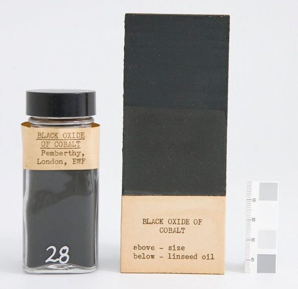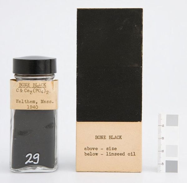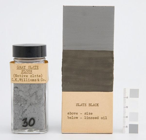 Curator: Here we have "Charcoal Gray," manufactured by James Newman in London, around 1927. It’s a curious object: pigment suspended in a glass jar, accompanied by a painted card. Editor: Stark. Immediately, I think of industrial processes and codified systems. The gray scale on the side feels so clinical. Curator: Indeed. Gray, after all, often signifies neutrality, or a space between extremes. Its cultural associations can be quite complex. Editor: And I wonder about the hand in this "manufactured" object. There's a tension between mechanical production and the artist's individual touch. Curator: Perhaps it’s a meditation on the industrial revolution’s effect on the art world. The symbol of mass-produced color challenges notions of artistic uniqueness. Editor: It certainly invites a deeper look into the commodification of artistic materials, and how even color can become a standardized product. Curator: It makes me consider how we perceive and categorize color itself, and its inherent cultural coding. Editor: For me, it’s a potent reminder of how industry and art are so deeply intertwined, shaping each other in unexpected ways.