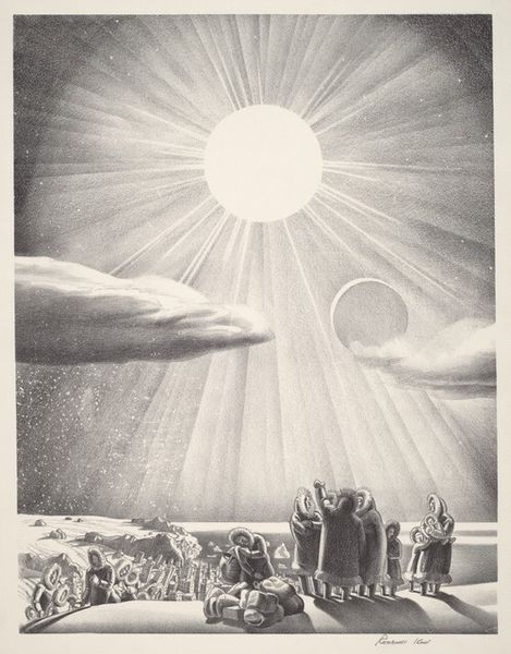 Rockwell Kent made this lithograph, Solar Flare-Up, with ink on paper. I like how the image is made by building up marks and lines. It’s like he’s constructing the scene bit by bit, revealing figures and a landscape at the same time. The texture is amazing, it reminds me of charcoal but with a much harder, finer quality. Look at the rays of light emanating from the sun. It looks like Kent used very fine, deliberate strokes that spread out across the paper. The stark contrast between light and shadow gives the scene a dramatic, almost biblical feel. The way the figures are rendered, with their smooth forms and classical poses, adds to this timeless quality. I find my eye is constantly drawn back to the contrast between the figures on the ground and the one standing. Kent's work reminds me of German Expressionist printmakers like Kathe Kollwitz, who also used stark contrasts and dramatic compositions to convey powerful emotions. Art is an ongoing conversation, isn't it?