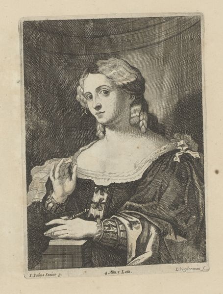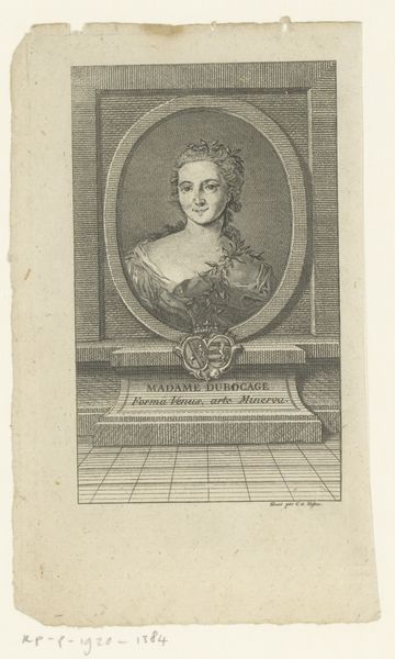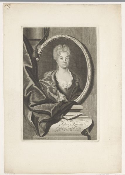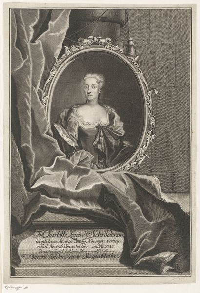 This is Johann Martin Bernigeroth’s "Portret van Johanna Christiana Wagner," made using etching. The composition immediately draws our eye to the oval portrait dominating the center, which softens the sharp rectangular architecture behind it. Bernigeroth uses stark contrasts between light and shadow which direct our gaze. The subject emerges from an inky black curtain, drawing her figure into sharp relief. To the right, a marble relief featuring an angel and another portrait provides an interesting counterpoint. This juxtaposition introduces a play of surfaces that oscillate between flatness and depth, the real and the represented. The contrast between light and shadow highlights the subject's face, drawing her features into sharp relief. This, combined with the oval frame containing her portrait, suggests a structuralist concern with enclosure and a semiotic engagement with conventional modes of display and representation. The work becomes an exploration into the dialectical relationship between illusion and reality.