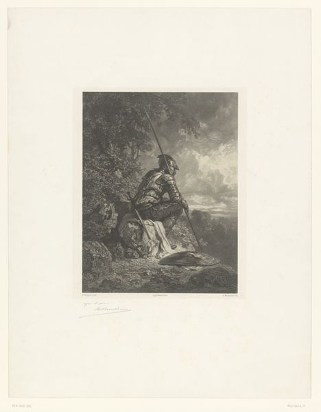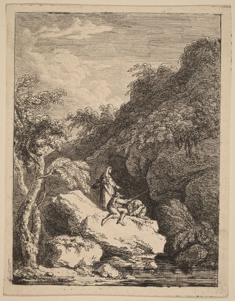 Johann Elias Ridinger created this print, "Vos met twee staarten," using etching, with no known date. Our attention is captured by a fox, strangely adorned with two tails, perched upon a rock amidst a somber, wooded landscape. The monochromatic palette enhances the intricate details rendered through fine, controlled lines, lending the scene a dramatic flair. The structure of the piece employs contrast and texture to direct the eye. The rough, etched lines that define the rocks and foliage sharply contrast with the smoother rendering of the fox’s fur, emphasizing the animal's peculiar form. It seems Ridinger is exploring a visual paradox—a natural scene disrupted by an anomaly. The fox with two tails challenges our notions of natural order and beauty, inviting us to reconsider the boundaries between the normal and the strange. The print's composition and texture serve to provoke thought, reminding us that art often functions as a mirror, reflecting not only our world but also the limits of our understanding.