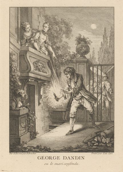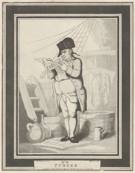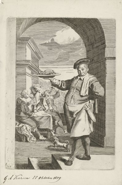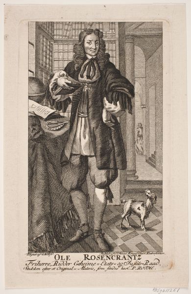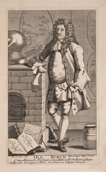 Editor: We're looking at Jean-Baptiste Tillard’s “Décrotteur (Shoe Shiner),” an engraving from the late 1760s. The figure seems caught in a moment of… I don't know, quiet weariness? What do you see in this piece, beyond its immediate subject? Curator: The artist does capture a specific kind of working-class fatigue, but I'd argue it's intertwined with a sharp social commentary. Think about the title—"Servants for Public Hire." It's less about the individual shoe shiner and more about the economic realities that forced people into these subservient roles. How does the setting inform this, do you think? Editor: Well, he’s indoors, standing awkwardly in what looks like a very nice home. So, there’s that contrast of classes right away. Curator: Exactly! Tillard cleverly uses the domestic space—the striped wallpaper, the portrait on the wall, even the ornate chair—to highlight the disparities of 18th-century French society. It’s not just a genre scene, it’s a visual statement about the social hierarchy and the precariousness of those who exist at its base. The Baroque period, though associated with ornamentation, produced critical voices questioning power structures. Where do you see evidence of this kind of "questioning" in the image itself? Editor: Hmm… maybe the shiner's downward gaze, and the slightly unkempt appearance? Like he doesn’t quite “fit” in this fancy interior. Curator: Precisely. The visual composition subtly undermines any sense of order and reinforces the notion of social unease and injustice. And the relatively clean shoes he’s meant to clean! Tillard encourages us to question the romanticized notions of the era. Editor: So, it’s less about portraying a specific person, and more about using him to critique a system? Curator: Yes, by portraying him with such directness and using the trappings of wealth to expose the cracks in that system. That's an early form of social activism using art. Editor: I see! Looking at it that way really changes how I understand the piece. Thanks for helping me unpack that. Curator: My pleasure! Art is never created in a vacuum, and exploring these layers is where the real meaning lies.