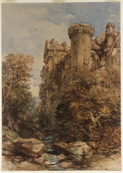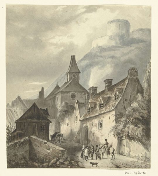 Editor: This watercolour painting is called "Old Tower, Frankfort" by Thomas Miles Richardson. It has a lovely, muted palette, giving the scene a rather dreamlike quality. What strikes you about its composition? Curator: The artist’s command of perspective and atmospheric rendering is clear. Note how the tower dominates, its verticality emphasized against the horizontal planes of the buildings and figures. The use of light and shadow creates a sense of depth and volume. Do you observe how the texture of the stone is achieved? Editor: Yes, it seems the washes create a soft, granular effect. I hadn't thought about the tower's height in relation to the rest of the scene before. Thank you. Curator: Indeed. And the careful blending of colours enhances the overall pictorial unity, drawing the eye upwards. The figures in the foreground add a sense of scale but do not detract from the architectural form. Editor: I see that now. I appreciate your insights.