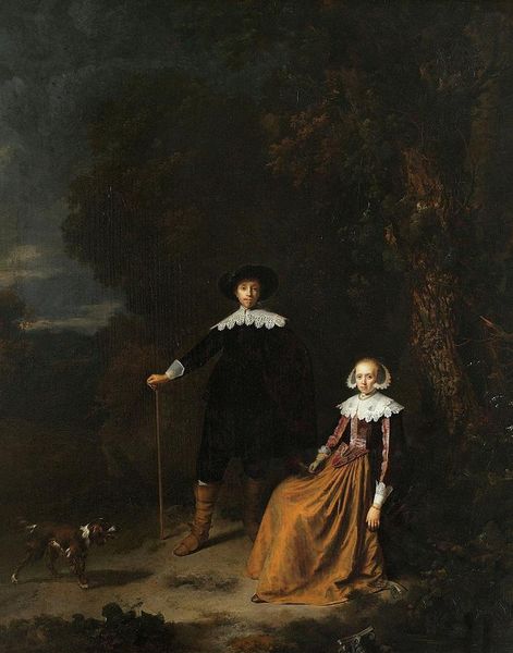 Curator: Looking at this painting, I’m immediately struck by the opulent textures, especially the gleam on the satins and velvets. The intimacy seems almost at odds with the formality of their attire. Editor: That's an astute observation. What you’re describing is “Self Portrait with His First Wife Isabella Brant in the Honeysuckle Bower,” painted by Peter Paul Rubens. Curator: The honeysuckle, then, becomes a significant detail? Editor: Precisely. The honeysuckle, or its variants in different languages, represents love and the sweetness of life together. It acts as a symbolic canopy sheltering the couple, subtly emphasizing themes of love and fidelity within marriage. Curator: But there's also a distinct power dynamic at play, isn’t there? His upright posture, her seated position... it hints at societal norms of the era. The setting too feels deliberate, placing them in a cultivated garden instead of a natural landscape. Editor: The power dynamic of course needs to be accounted for in a historical frame. He painted this circa 1609, just after returning to Antwerp from Italy, so this work marked not only his marriage, but also his professional homecoming, in a way. It announces his arrival as a successful artist in a society with very clear structures. His hand position, resting casually near his sword, sends subtle but unmistakable message. Curator: Yes, there's a feeling that even the surrounding nature has been ordered and structured according to his will, so to speak. Do you feel this is merely celebratory or could it be subtly provocative? Editor: Rubens frequently portrayed complex characters operating in highly charged atmospheres. To the aristocratic patrons of the era, his skill lay not in merely capturing the moment, but also representing it through potent and widely understood visual metaphors. The picture served as both a proclamation of marital harmony and a signifier of affluence, intellectual prowess, and artistic skill. Curator: Considering all that, what resonates most is not the literal likeness, but the depth of shared history and affection imbued through symbols within this context. Editor: I agree. Its continued significance lies in how it captured something truly personal while still remaining embedded in the language of its time.