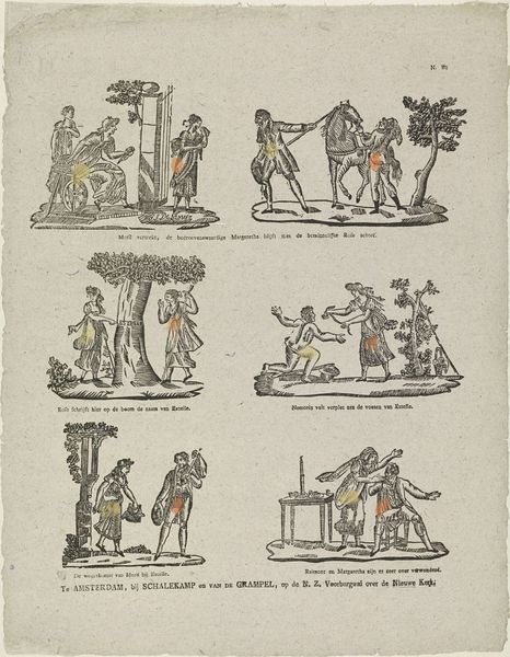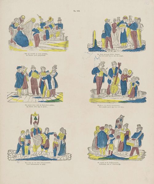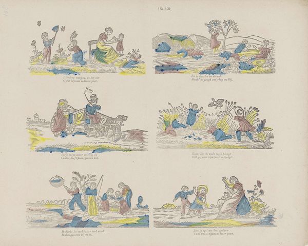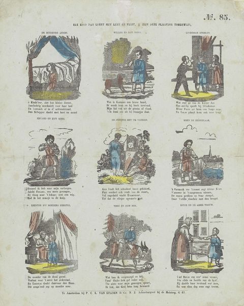 M. Hemeleers-van Houter made this print, "Verschillende taferelen," using lithography sometime before 1880. Each scene provides a glimpse into the social lives and labors of 19th-century Europeans. We see soldiers, farmers, and what appears to be a wedding celebration. Each vignette is labeled, providing insight into the artist's perspective on these scenes of everyday life. The rigid lines and somewhat flat depiction of each figure points to its likely status as a popular print, perhaps produced for instructive purposes. These kinds of images give art historians a valuable window onto the concerns and values of different social classes in Europe at this time. Prints were often made to celebrate patriotic sentiments or to endorse particular political positions. Further research into the symbolism of these scenes would help contextualize the print's role in 19th-century visual culture. These images are valuable resources for social and cultural historians.