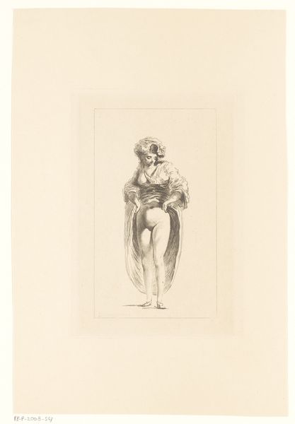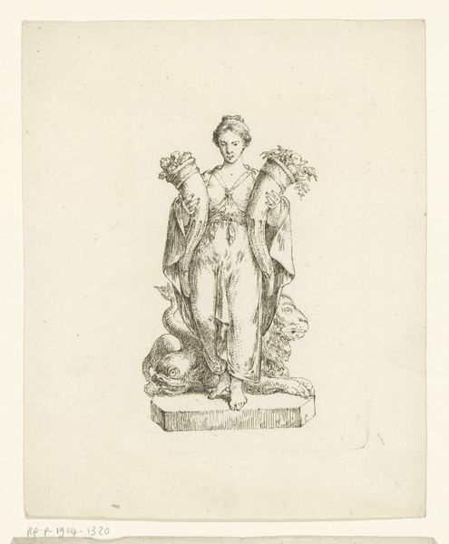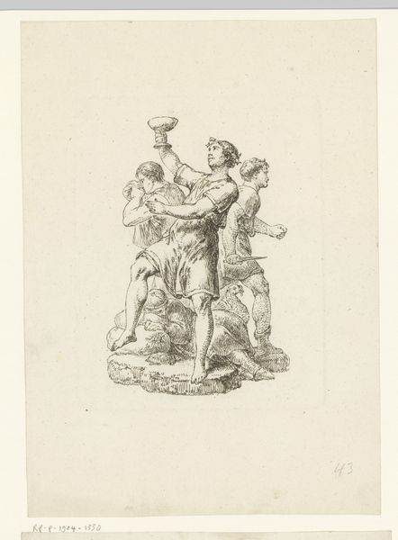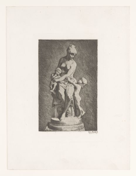 Curator: Let’s turn our attention to Joel Ballin’s “Apollon med plektret,” which roughly translates to "Apollo with the Plectrum", made sometime between 1822 and 1885. What do you think of this rendering? Editor: Well, Apollo here certainly cuts a striking figure. Immediately, I see the stark contrasts – it’s all shades of grey. A solemn grandeur emerges from such restricted tonal choices, no? Curator: Indeed. Ballin’s focus here on Apollo – god of music, light, and healing – presented nude and in such classical style really emphasizes the...material reality that art wants to turn itself into. Here is the sculpture through the filter of the printmaker’s labor, after all! The idea of divine beauty, put into the real and often dirty work of art. Editor: Yes, I see what you mean. Looking closely, you begin to realize how physically demanding engravings are: carving all those precise lines... Ballin labored at creating Apollo from a different raw material. The shift really gives this idealized form such surprising and humble humanity. Curator: Exactly! In the neo-classical period, there was, of course, a certain fascination with reproducing Greek and Roman sculpture. The question remains though; How do we reconcile the godlike with the man-made? I think, what are those conditions that permit art? How does culture affect our labor? Ballin takes our Greek subject and adds, what could be described as a Danish aesthetic. Editor: Thinking about "labor," I noticed something I never usually think of – is that the music made on Apollo’s instrument would’ve surely provided accompaniment to physical labour: rowing songs to cadence manual exertion and weaving or knitting to accompany fireside toil! Now we’re far away from the purity of sculpture but maybe a bit closer to the essence of art… Curator: A compelling observation. He looks rather caught in time: he plays a divine music for the world, which speaks to more human concerns like everyday life. Editor: Right. What Ballin crafted speaks to the inherent link between the ideal and the material – he really made art into itself. Thank you for highlighting all the important things we may find in "Apollon med plektret," an exceptional, almost dream-like depiction that continues to haunt my ideas surrounding classical art.