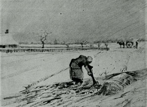 This drawing, *Bench with Three Persons*, by Vincent van Gogh, was made with graphite pencil on paper. Van Gogh's choice of graphite, a relatively inexpensive and readily available material, speaks to the accessibility and immediacy of drawing as a medium, especially for capturing fleeting moments and scenes from everyday life. The use of hatching and cross-hatching creates a sense of depth and volume, defining the forms of the figures and the surrounding landscape, with the graphite allowing for subtle gradations in tone. The grainy texture is apparent, giving the impression of softness and volume. The immediacy of the material meant the artist could capture scenes of working-class citizens at their leisure. Through these techniques and use of material, Van Gogh creates a poignant portrayal of human connection and solitude within the context of the natural world. It reminds us that art can be found not only in the grand and monumental but also in the quiet and intimate moments of everyday life.