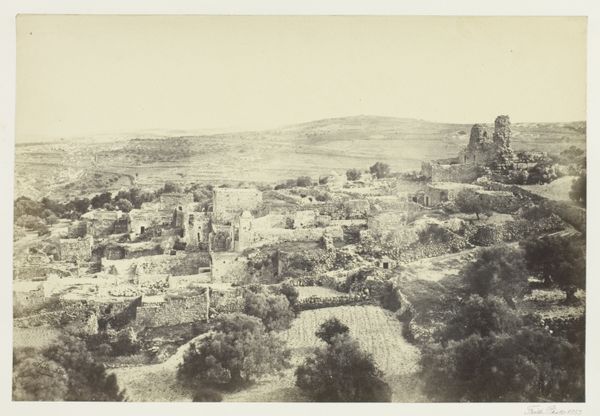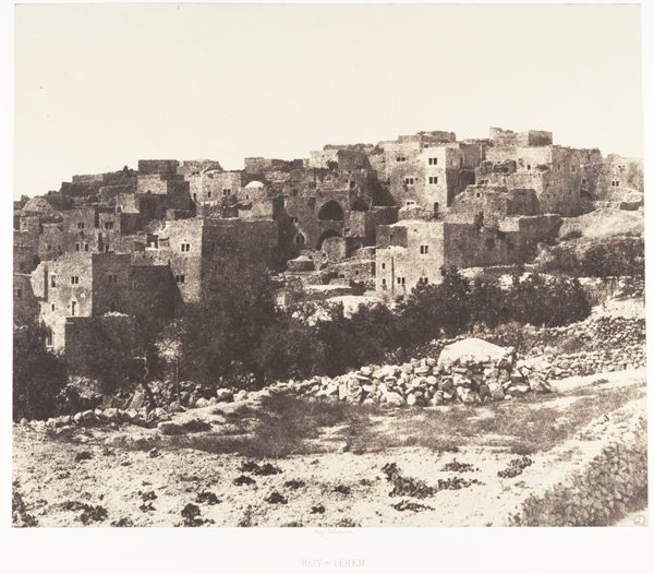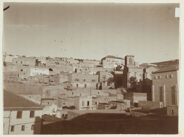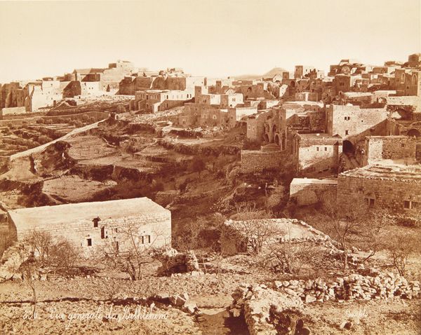 C. & G. Zangaki captured this view of Bethlehem with a photograph of albumen silver print. The monochrome image presents a dense urban landscape, punctuated by the organic forms of trees. The overall effect is a study in contrasts between the structured architecture and the natural environment. The composition is formally divided into horizontal layers, with the built environment dominating the upper portion. The buildings, uniform in tone, create a grid-like pattern that is only softened by the subtle variations in light and shadow. This ordered arrangement is juxtaposed with the lower portion of the image, where trees are distributed somewhat unevenly. The use of a muted palette emphasizes the texture and form of the buildings and foliage. The materiality of the albumen print adds an additional layer of meaning. The physical qualities of the photograph, its tonal range, and its capacity for detailed representation, invite us to consider the interplay between the objectivity of the photographic medium and the subjective interpretation of the artists. The image provides a perspective on urban space.