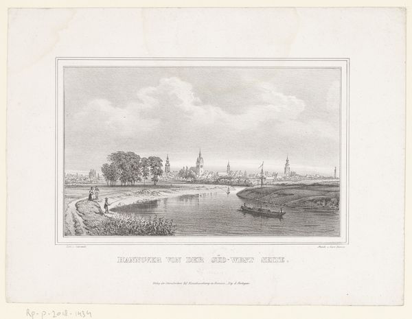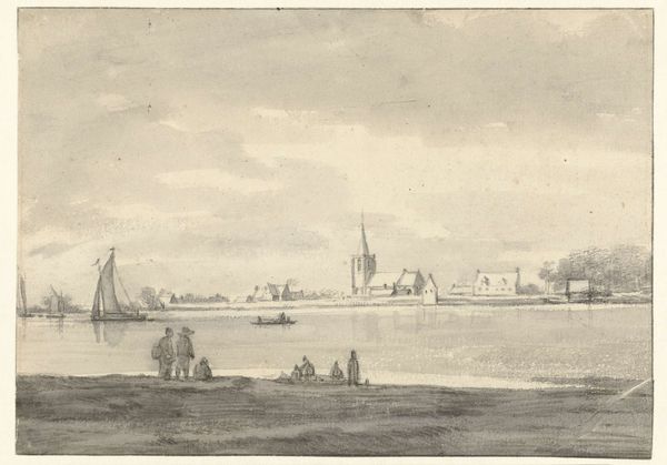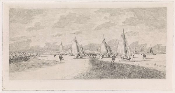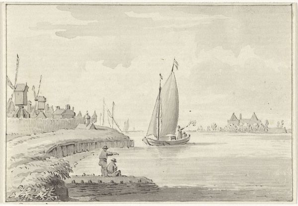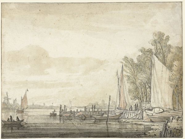 Curator: Ary van Wanum created this piece, "Groot vlot en verschillende schepen op de Merwede bij het huis de Merwe bij Dordrecht," which translates to "Large raft and several ships on the Merwede near the house de Merwe near Dordrecht," around 1775 using drawing and etching techniques. It gives such an expansive view of the waterway! Editor: Yes, the first impression is one of tranquility. The tones are soft, and even with all the human activity depicted, a sense of calm prevails. Curator: Notice how the use of light-colored washes gives depth to the water and sky. I am drawn to the material culture it presents – look at the ways people built these rafts for transport, presumably to facilitate some form of commerce across the river, right at Dordrecht. Editor: I agree! The river Merwede acts as a symbolic threshold, almost liminal space, reflecting a blend of journey and passage, yet anchoring us to the solid ground of Dordrecht. And look at those sailboats. A vessel with raised sails always holds that potential for opportunity. It presents an emblem of hope. Curator: Hope yes, but it's about labour as well. These sailboats represent material costs, carpentry skills, networks of supply chains, trade dependencies – there is the business of boat-building embedded in the final scene depicted by the artist. These are important, tangible traces. Editor: Absolutely. And the town of Dordrecht in the background almost blends with the horizon, as if it’s part of the river's visual narrative. Dordrecht stands for centuries of mercantile ambition – a steadfast, familiar backdrop, enriched by the ships navigating toward possibility. It shows that, since then and now, the waters bring people and wealth together. Curator: It truly displays how commerce has reshaped this region and everyday life of this place through water navigation technology. Considering van Wanum used etching to capture this industrial activity provides some indication as to what types of reproductive technologies were circulating back then. Editor: Fascinating indeed, this picture speaks across generations. Even now it reminds us of a time when rivers, boats, and waterfronts had deeper emblematic importance to a populace. Curator: So very true. It illustrates in detail both maritime ingenuity and how these water transport technologies came to shape cities. Editor: Beautifully said! A final quiet glimpse into Dordrecht's rich history on the water.