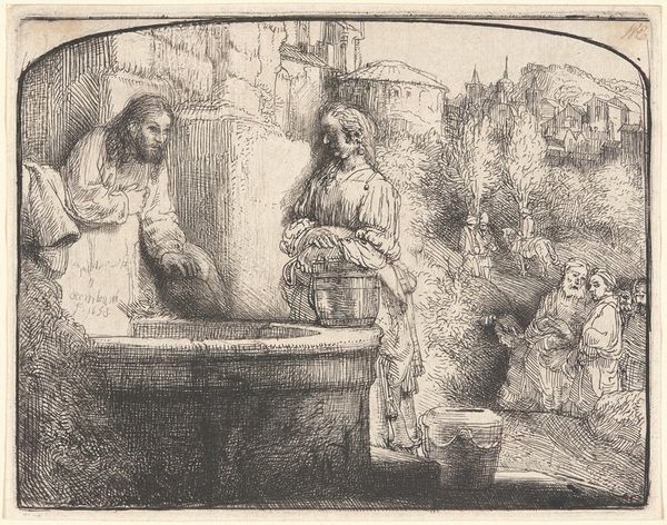 Curator: Ah, Rembrandt. Looking at this print, “Christ and the Woman of Samaria,” made in 1657, hanging here at the Rijksmuseum, I can feel the weight of centuries just... dissipate. It feels immediate, like a whispered secret. Editor: It's interesting, that immediate feeling. To me, it feels so carefully constructed, this etched narrative laid out on paper. What’s striking is the labor behind each tiny stroke of that etching needle; the almost industrial process in getting the master's art to the masses. It begs the question: What even constitutes the "original"? Curator: That labor, that careful crafting—it’s a form of devotion, isn't it? He's imbuing every line with such concentrated emotion. You can almost see the woman’s heart opening in the flickering light. He’s letting the light touch what needs to be illuminated within her. Editor: Yet what I see highlighted most are the everyday items - the well where they meet, the buckets used for their daily lives. It almost seems Rembrandt wants us to consider that it’s not a grand theological battle, but instead it happens through routine work, labor, and ordinary conversations. Curator: Absolutely, it is profoundly intimate. Even the landscape surrounding them feels like a participant in this subtle, transforming exchange. The etching captures that fragile moment when beliefs shift. What are you thinking about, those other people, watching this conversation? I like to see how he brings so many lives, those of observers too, into the center. Editor: That focus is clever: look closely, you see the wear and tear on the very copperplate itself becomes another layer of "reality," highlighting that this spiritual awakening is deeply interwoven within our material conditions. The image and object itself shows time, doesn’t it? Curator: You are so right. Even as we stand here observing, reflecting, our understanding shifts; our experience of this etched scene alters our reality too. Isn't that what art does, ultimately, change everything around us. Editor: Definitely. It reveals how our interpretation hinges not only on spiritual contemplation, but also an active consideration of our social context, the labor involved, and our individual consumption. Every piece invites new insight.