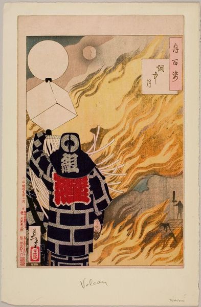Curator: Ah, the Enchū no tsuki, "Moon at Enchū," a woodblock print crafted in 1886 by Tsukioka Yoshitoshi. Editor: It hits me right away – such potent stillness. It's as though time has stopped, the fire’s blaze muted beneath the colossal presence of the moon. Curator: Yoshitoshi produced this work as part of his series "One Hundred Aspects of the Moon," exploring both historical and mythical lunar connections. This piece supposedly illustrates the story of Itō Sukechika holding a signal fire aloft during a clandestine night raid, mirroring a pale moon against a smoky, fiery sky. Editor: So, history painted on a grand scale! And how cunning to use geometry—the rigid cube against that fluid wash of heat, all countered by a spectral disc hovering at the very top. It’s about creating layers within layers, not just a flat surface of visual stimulation. It’s almost hypnotic in the depth and the balance of such dissimilar features. Curator: Absolutely, Yoshitoshi's genius lies in his ability to merge the traditional Ukiyo-e style with the unsettling tensions of modern life during the Meiji Restoration, with that transition marked by intense periods of social upheaval. The print serves as a mirror reflecting society's yearning for steadiness and historical narrative amidst rapid transformations. Editor: It reminds me of an inverted altar; instead of sacred icons, we get smoky skies and geometric forms paying homage to the past, perhaps mourning what's already slipping into the shadows of this new modern era. It seems the figures on the rooftop are caught in the crossfire between what’s tangible below them, burning—and what feels eternally distant up above. Curator: Precisely, you touch on Yoshitoshi's emotional depth—the human longing captured in such an emblematic design. Editor: I’m off pondering where my own moon sits amidst the ever-evolving flames. Thanks, Tsukioka. Curator: Indeed, the interplay between tradition and transformation, stark stillness amidst fiery motion, leaves lingering impressions long after we walk away.