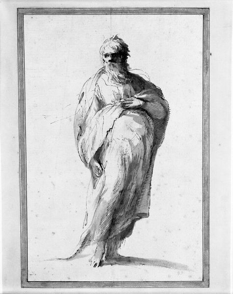 Curator: This is an engraving of "God the Father with the Globe in his Hands," based on a work by Guercino. It is part of a larger suite engraved by Giovanni Battista Piranesi. Editor: It has an unfinished feel somehow. Those lines are so lively; I imagine the artist sketching rapidly. Curator: The "unfinished feel" may speak to its method of production: Piranesi often employed assistants in his workshop to complete etchings based on his designs. Each line would require time and deliberate work using acid. So what we see here might highlight how the production of artwork requires the work of many hands and long days. Editor: I see. There is a kind of rugged tenderness, despite the monumental subject, no? He looks rather burdened with his globe. Almost like he's thinking: 'Oh, blast, what shall I do with this lot?' Curator: Indeed, engravings like this were crucial in disseminating visual ideas to a broader public. This method makes previously exclusive paintings by artists like Guercino accessible to print buyers. By the act of reproduction, religious subjects can be placed in different social contexts as people bring the images into their own homes or places of worship. Editor: It does provoke a lot of feelings, though, to see a great bearded figure looking slightly glum. There is something very appealing about it. Also, note the use of crosshatching here to depict shade on his divine, well-worn robe. A bit austere and economical if you think about the kind of effect Guercino can create with oils, yet affecting. Curator: These visual shorthands are born of particular media and labor requirements. It's easy to forget that an image that feels spiritually immediate now went through very hands-on material procedures to emerge, with many decisions about who, how, and what purpose would it serve at the fore. Editor: So much to reflect upon just in an old reproduction. Still, I would hang that on my wall happily! The raw honesty speaks to something very immediate despite it coming down to us over the centuries. Curator: Yes, an object rooted both in commerce and piety; mass consumption and reflection, all at once. A true artifact.