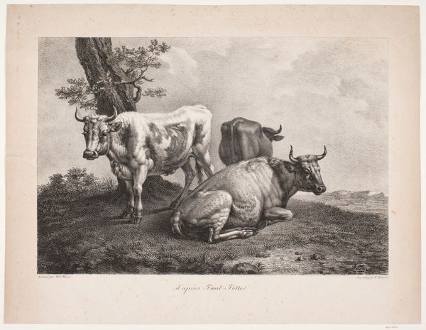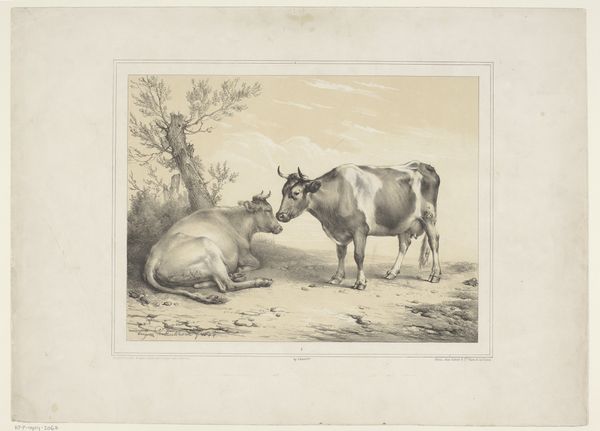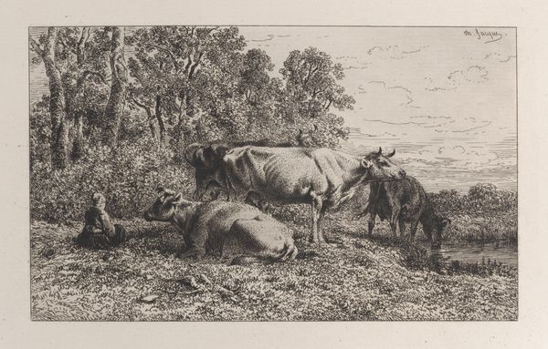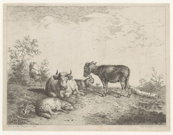 Curator: Here we have "Five Cows in a Meadow" by Joseph Zephyris Gengembre, a drawing made sometime before 1870, now held in the Rijksmuseum. The artwork appears to be executed with charcoal and pencil. Editor: It strikes me as quite serene. The muted tones and relaxed postures of the cows evoke a sense of rural tranquility. There’s something so powerfully bucolic in the simplicity of it. Curator: Yes, and within the genre-painting tradition, such scenes served distinct social functions. Rural life, when rendered idyllic, often reinforces particular social structures and norms regarding labor and land ownership. Who benefits from romanticizing farm life? Editor: The cow, in its essence, has been revered across many cultures, standing as a symbol of nurture, abundance, and maternal care. Think of ancient Egypt, where the cow goddess Hathor represented motherhood, or in Hinduism, where the cow is sacred and represents generosity. Does Gengembre play with that deep symbolism? Curator: It's possible, though the cows don't appear idealized. There's an interesting contrast here. The pastoral theme tends to sanitize rural existence. But in this portrayal, we aren't shown healthy cattle; some seem lethargic. Considering it was rendered prior to 1870, there could be some social commentary tied into that portrayal. Editor: The subtle use of shading definitely adds to their heaviness. Look at how the artist captured the texture of their hides! There's a very tactile quality, almost like one can feel the rough surface. I suppose cows also represent the material and the tangible, the physical existence and mundane tasks. Curator: Which speaks to the ongoing historical dialogue about the social conditions of labor and agricultural workers. How the cow's representation becomes part of those debates about material existence—food, production, and property. Even in this relatively quiet artwork, there’s an entire network of class struggle. Editor: I see your point. Thinking of cultural memories layered within symbols offers richer, at times conflicting, interpretations, pushing our understandings in intriguing directions. Curator: Indeed, by examining those narratives alongside art history and political dynamics, we move toward an expansive appreciation. Editor: I'm grateful for these details you pointed out, to reveal how layered even the quietest scenes can be.