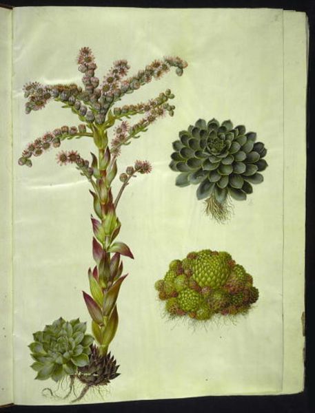 Editor: We are looking at a botanical illustration titled "Sedum album…" by Hans Simon Holtzbecker, created between 1649 and 1659 using watercolor, gouache, and coloured pencil. The composition of multiple succulents, depicted with such attention to line and texture, it almost appears as a scientific study of sorts. How do you approach such a detailed drawing? Curator: I find the linear precision arresting. Observe the rendering of each leaf, the careful graduation of color, the controlled application of the media. Holtzbecker prioritizes fidelity to the observable form. Ask yourself: what structural elements contribute to this sense of scientific detachment? Editor: I see what you mean about detachment; there’s no romanticism, only meticulously rendered form. Are the spatial relationships meaningful beyond their scientific arrangement? Curator: Indeed. While representational accuracy is paramount, the placement on the page creates a visual hierarchy. Consider the central stem, its verticality asserting a visual dominance against the clustering forms. Does this organization suggest a deeper compositional intention beyond mere cataloging? Editor: I think it does, but I'm still unsure how to decipher it. Are the variations in light and shadow simply for accuracy, or do they perform a more complex function? Curator: Note the evenness of illumination, mitigating stark contrasts that might otherwise evoke drama. This subdued approach allows the intricate morphology of each plant to assert itself. Is this emphasis on evenly distributed light, in effect, communicating something in and of itself? Editor: Perhaps it is to suggest something of equality in nature and the eye. It almost suggests an understanding between art and science… Thank you. Curator: Precisely. Reflecting on Holtzbecker's illustration helps refine one’s perspective regarding artistic methodologies of observing the natural world and opens fascinating possibilities for thought.