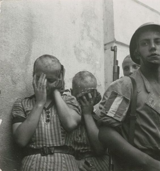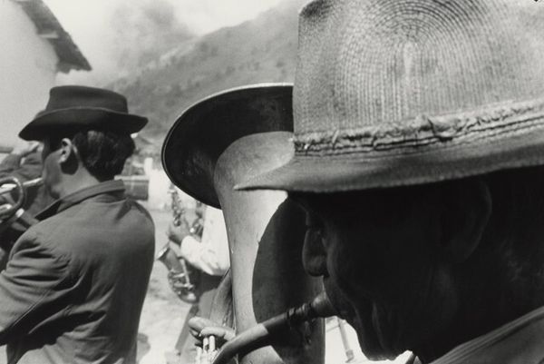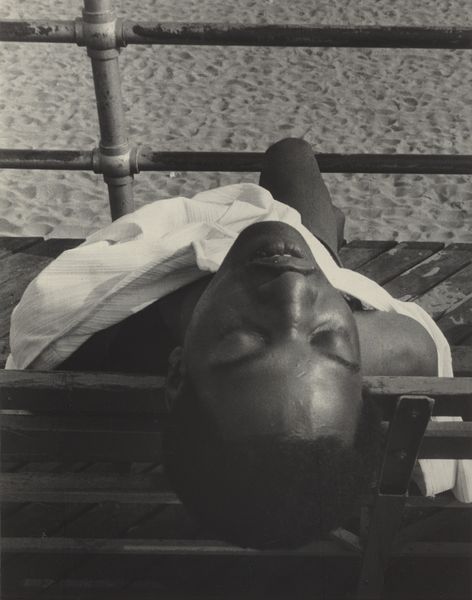 Curator: Let's turn our attention to "Coney Island," a compelling photograph by Leon Levinstein, circa 1960. What strikes you initially? Editor: The density, and the anonymity. A crowd of men, mostly bare-chested, compressed into a single, almost sculptural mass rendered in shades of gray. It feels oddly isolating, despite all the bodies. Curator: Indeed. Note Levinstein’s masterful use of composition here. The cropping is severe; figures are cut off, and faces are obscured, prioritizing texture and form. The bald head in the foreground serves as an anchor, doesn't it, drawing the eye and emphasizing the grain of the photograph? Editor: It does, almost violently. This deliberate anonymity and the focus on physicality suggest a commentary on the working classes in America. Coney Island, at that time, a refuge—perhaps, in their struggle with the system. Curator: Perhaps. However, it may also echo ideas present within formalism. Focus, instead, on the tonality; Levinstein avoids pure blacks or whites. Everything is muted, subtly rendered, focusing on geometric planes of heads and shoulders in tight succession. Consider how this creates spatial ambiguity, flattening the image while also conveying depth through varying textures. Editor: All right, but these photographic techniques surely enhance, not negate, a social dimension. These choices amplify the sense of bodies pressed together on a sweltering beach—economically pressured into leisure together and hinting at certain male social structures? Curator: Undoubtedly the photograph hints, perhaps intentionally or not, at social structures. I’m most compelled by his engagement with light and shadow and how he shapes these elements into forms, almost sculpting with the camera. A key point would be the way in which the negative space defines the mass itself, creating its distinct volume. Editor: Fair enough. I'll grant the visual intricacies certainly stand out, providing insight into a unique art. Though, ultimately, my mind races more with questions: the relationship of that space to those within it, their proximity hinting at anxieties of the age... Curator: Ultimately, it presents us a moment pregnant with interpretative possibilities. Editor: An image of ambiguity, inviting questions as much as offering answers, a poignant capture.