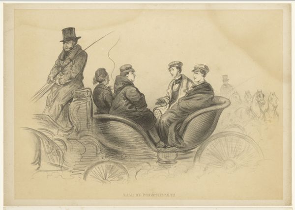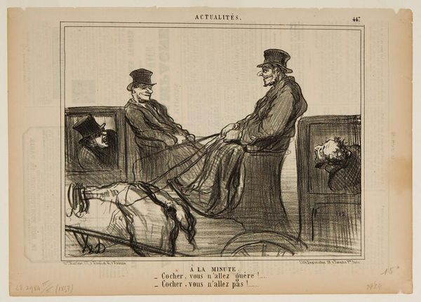 Honoré Daumier created this lithograph, Paid By the Minute, as plate 447 for his series Actualités. Daumier lived through considerable political upheaval in 19th-century France, and his work often critiques the bourgeoisie and their obsession with money. Here, we see a caricature of a horse-drawn carriage with two passengers berating the driver for their lack of speed. The title, "Paid by the Minute," encapsulates the anxiety of a rising capitalist class fixated on the relentless march of time as it correlates to money. The emotional depth comes from Daumier's ability to capture the impatience and the absurdity of a society consumed by financial gain. Daumier challenges conventional representations by highlighting the tensions between different social classes, and he uses satire to expose their flaws. This print serves as a sharp commentary on the human condition, where economic pressures distort our interactions and values.