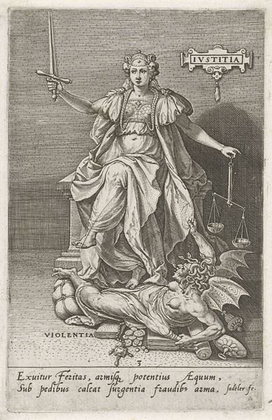 Johann Sadeler I created this engraving, “Wijsheid (Sapientia) overwint Menselijke Verbijstering (Caligo Humana)”, sometime between 1550 and 1601, now held at the Rijksmuseum. The composition is dominated by the figure of Sapientia, or Wisdom, enthroned above Caligo Humana, representing human ignorance. The stark contrast between light and shadow, achieved through fine, precise lines, accentuates the tension between knowledge and obscurity. The artist’s approach uses symbolic elements arranged within a strict hierarchical structure. Sapientia holds a mirror with entwined snakes, a symbol of prudence, while a dove hovers above her head. The book she holds open displays fragmented words, hinting at the piecemeal nature of learning. Beneath her, Caligo Humana is cast in shadow, her eyes covered, symbolizing a lack of insight. This work can be understood through a semiotic lens. The objects and figures are not merely representational, but function as signs within a complex cultural and philosophical discourse. It explores the interplay between knowledge and ignorance, suggesting that wisdom triumphs over human fallibility through reason and enlightenment.