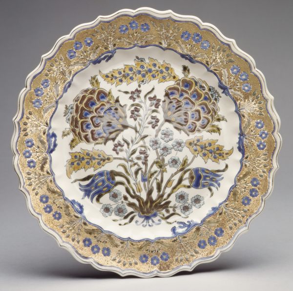 This brilliant plate exemplifies the Ottomans' successful attempt at polychromy, in which a clear white body (tin-glazed earthenware) forms the ground for bright blue, green, and red underglaze motifs. The foliate rim is decorated in a stylized wave pattern ultimately based on a Chinese prototype. Because Ottoman sultans amassed large collections of Chinese ceramics, imported wares naturally influenced local production. The potters of Iznik, however, soon created an original decorative vocabulary. The tulips, pinks, irises, and cypress comprising the center of this dish, for instance, are not found in this combination on Chinese wares.