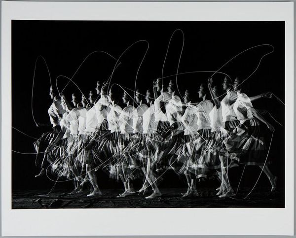 Editor: So, this is Harold Edgerton’s "Baton Multiflash," a black and white photograph. It looks like it’s trying to capture movement, but in a very scientific way. What visual language do you see being employed here? Curator: The baton becomes a symbol of time itself. Notice how the stroboscopic flashes reveal not just position, but the very nature of motion and change. Doesn't it remind you of Muybridge’s motion studies, but with a single, elegant object? Editor: I see what you mean. It's less about the baton itself and more about what it represents. Curator: Precisely. It’s a cultural memory of scientific progress visualized as a dance. What does the starkness of the black and white add? Editor: A timeless quality, I suppose. Like it could be from the past, present, or future. I'm starting to see so many possibilities here. Curator: And that's the power of a well-chosen symbol – it transcends its immediate representation.