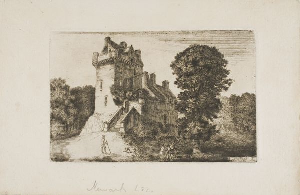 "Crichton Castle" is an etching made by John Clerk of Eldin, an artist born in Scotland in 1728. Here, the ruins of Crichton Castle loom above two figures on a path, enveloped by the shadows of the surrounding trees. Clerk of Eldin was born into the Scottish landed gentry. His position afforded him the opportunity to explore his artistic and scientific interests. His social standing is essential to understanding his aesthetic choices. His etchings reflect a Picturesque sensibility, framing the Scottish landscape as both beautiful and sublime. The figures in the foreground are dwarfed by the castle, emphasizing the vastness of the landscape and the weight of history. One can't help but wonder about the stories held within those stones, stories of power, conflict, and perhaps even love. What do you feel as you peer into this landscape? Clerk's "Crichton Castle" transforms the Scottish landscape into a stage for reflection, inviting us to contemplate our place within the grand narrative of history.