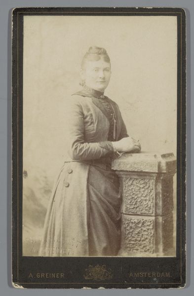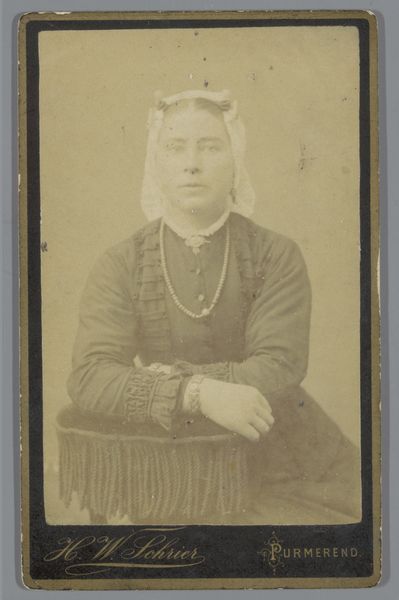 Curator: This is a gelatin-silver print by P. Siewers & Zoon, a photographic studio active in Edam and Purmerend in the Netherlands. The work, titled "Portret van Dieuwertje Buurs," dates from between 1857 and 1898. Editor: My immediate reaction is to the muted tonality and how it creates a sense of stillness. It’s predominantly about texture, from the sheen of the dress to the almost sculptural quality of the chair’s ornate back. The play of light seems crucial to how we perceive depth. Curator: Indeed. Let's consider this stillness further through a socio-historical lens. Photographic portraits in the late 19th century were often significant markers of social status and were especially prominent amongst the burgeoning middle class. The subject's carefully posed demeanor, attire, and even the studio props such as the table, would project particular messages. Editor: Agreed. Semiotically speaking, the dress—while relatively simple—conveys a sense of respectability and perhaps quiet prosperity. Note the slight variations of light on the material; they almost resemble brushstrokes in painting. Curator: Precisely. Studios like Siewers and Zoon were key players in the visual economy of the time, creating and reinforcing social norms and hierarchies. Consider that the widespread availability of photographs gradually democratized portraiture, even though initially, it remained costly. Editor: From a formalist angle, the composition uses a deliberate balance. Dieuwertje is positioned slightly off-center, yet the framing feels complete because her form fills almost the entire image space. I’m drawn to the visual rhythm created by the buttons on her bodice leading upward to the subtle details in her headdress. Curator: That close observation is useful. Viewing the photograph today offers glimpses into the personal identities of individuals and into the societal values placed on public image. Also, let's consider that most people may only have had a photograph taken once or twice during their entire lifetimes, elevating each portrait to a landmark of identity. Editor: Considering all of these features—the formal arrangement, the careful detail in the dress and even the subtle expression of the subject—it becomes evident that there is much to see beyond mere surface appearances. Curator: Ultimately, reflecting on an artifact like this image reveals insights into the complexities of 19th-century society while also challenging our understanding of the evolving dynamics between art and its cultural context.