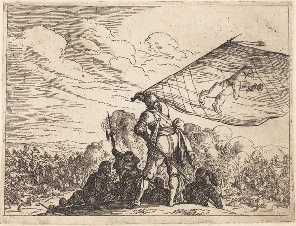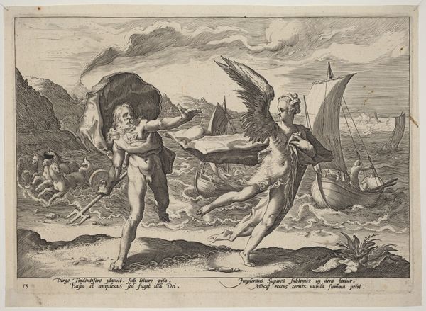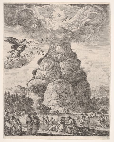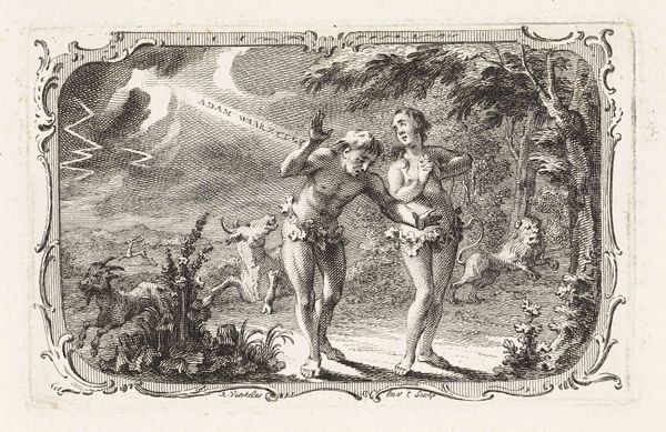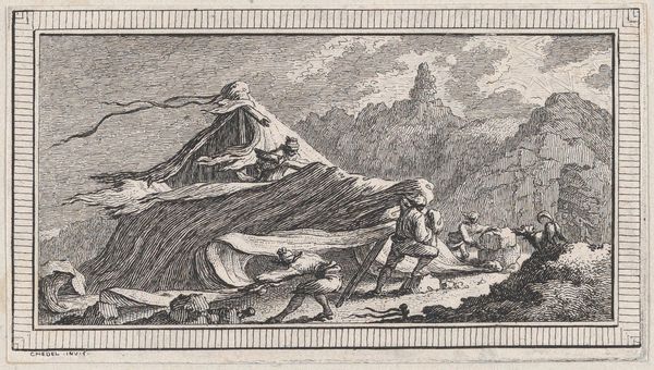 Editor: We’re looking at “Book 4, Fable 13: the treasure (Le trésor),” an engraving by Nicolas Henry Tardieu from 1719. It feels very classical, a bit like something you'd see illustrating an ancient myth. The figure with the sword facing off against a dragon immediately creates a scene of conflict. What's your take on it? Curator: This piece immediately draws my attention to the inherent power dynamics at play. We have this classical hero, armed and seemingly divinely sanctioned, pitted against a mythical beast, often coded as chaotic and untamed. But let’s think critically: Who defines what is "treasure," and for whom is it truly valuable? Is this a tale of valor or of colonial conquest disguised in allegory? Consider how these narratives historically justify the displacement and dispossession of marginalized communities under the guise of taming the "savage." Editor: That's a perspective I hadn't considered! So, you see the dragon not just as a monster, but almost as a symbol of something else? Curator: Exactly! The dragon, in its otherness, becomes a stand-in for those who are perceived as obstacles to the hero's, and by extension, society's progress. This image begs the question: Whose story is being told, and whose is being erased in the process of claiming this "treasure?" What happens to the dragon's hoard – where does that wealth ultimately end up? Whose hands profit from the hero's victory? Editor: It completely shifts the narrative! It is no longer just a battle, but it becomes a reflection on societal structures. Curator: Precisely. It is crucial to examine these images with a critical eye, understanding them not as simple illustrations, but as powerful cultural artifacts that reflect and reinforce prevailing ideologies and power structures. These artworks reveal much about gendered roles, social privilege and biases and cultural expectations during the baroque era and maybe our own. Editor: This has certainly opened my eyes. I'll never look at these old myths in the same way again!