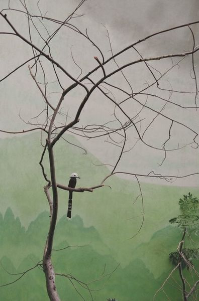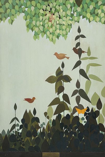 Editor: This is "Zaunkönigpaar (Hagschlüpferli)," or "Wren Couple," a tempera painting by Adolf Dietrich, created in 1937. I'm immediately struck by the intense detail, particularly in the leaves and branches. How do you see the composition working in this piece? Curator: The painting presents a fascinating study in compositional balance. The interwoven branches create a dense, almost tapestry-like surface. Note how the repetition of the leaf shapes establishes a rhythmic visual field, countered only by the birds' presence and placement. The overall composition flattens the picture plane. What does the application of tempera suggest to you about the artist's process? Editor: Well, tempera seems like it would demand a lot of precision... maybe slow and deliberate mark-making? It definitely contributes to that sense of minute detail that I see. Curator: Precisely. Dietrich's technique highlights a conscious exploration of form. The linearity emphasized through the branches offers a structural framework, and the birds serve as focal points, disrupting, yet harmonizing, the organic forms. Consider how the layering of the leaves and branches creates a sense of depth despite the flat picture plane. Do you think this flatness is successful? Editor: It's interesting. I think it creates an immersive quality; it feels like you're right in the thick of the foliage. It definitely makes you appreciate the details. Curator: Exactly. Through rigorous control and attention to form, Dietrich crafted a carefully structured and immersive landscape. A naive synthesis of observation and design. Editor: This has really opened my eyes to looking past just the subject matter. Focusing on the compositional elements gave me a new appreciation for the artist's skill. Curator: Agreed, and by analyzing these artistic elements, we gain a clearer understanding of Dietrich's intentions and his manipulation of the medium.