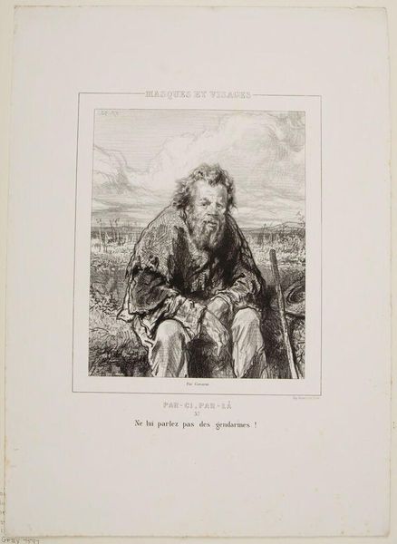 Editor: This is Paul Gavarni's print "Monday. Philosophy and Fried Rabbit." The figure seems to be lost in thought, or maybe just tired. It's a simple image, but there's a melancholic feeling to it. What stands out to you in this piece? Curator: Oh, it's the eternal Monday, isn't it? We've all been there. Gavarni captures that feeling of philosophical exhaustion perfectly. The rabbit, though, hints at some small pleasure amidst the gloom, a little wink of dark humor. Perhaps he’s wondering if that rabbit was worth it. Editor: So, the title adds another layer to the interpretation? Curator: Absolutely! It’s a reminder that even philosophy can't cure the Monday blues. It's a clever observation, a shared human experience wrapped in a simple drawing. Editor: I never thought about Monday in such a poetic way before. Curator: And now you will always see it with a fried rabbit in mind.
