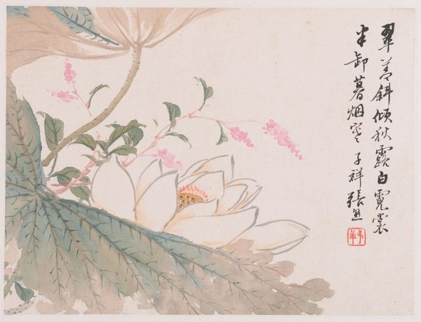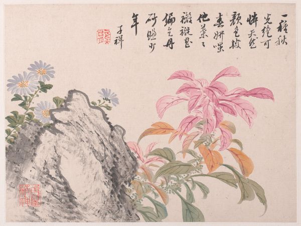 Curator: This woodblock print, Iris and Peony, from Kubo Shunman's series *An Array of Plants for the Kasumi Circle*, whispers of tranquility. It's delicate. Editor: I'm drawn to the tension in the layered ink work, the way the lines convey both fragility and a vibrant life force. Curator: Shunman was a key figure in the Edo period's artistic landscape. The Kasumi Circle was a poetry and art club, so this print engages with complex social and intellectual networks of the time. The presence of text intertwines visual and literary narratives. Editor: Absolutely. The poems, combined with the deliberate composition, speak to a refined understanding of nature and its reflection of societal ideals. We see the careful creation of pigments, the printmaking process, all point to the labor involved in this aesthetic. Curator: Exactly, and the choice of iris and peony—symbols of different social groups and cultural values—highlights the intricate dance between identity, status, and artistic expression. Editor: Examining the materiality reveals the work's place within a larger system of production and consumption, and deepens our understanding of its cultural value. Curator: It’s a beautiful example of how art can be both aesthetically pleasing and deeply embedded in historical and social context. Editor: Indeed, a testament to the power of process to reveal deeper meaning.
