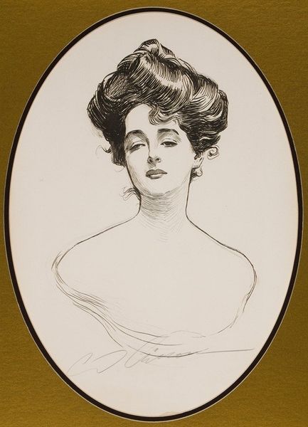 Curator: Ah, here we have Paul César Helleu's portrait of Constance Herbert, second Marchioness of Ripon, a delicate pencil drawing. What's your first take? Editor: There's an almost ethereal quality to her, wouldn’t you agree? A certain quiet strength too; she holds your gaze, even in this fleeting sketch. It whispers of the constraints placed upon women in her position and era. Curator: Fleeting is a perfect word! Helleu was all about capturing a sense of momentary beauty, like trapping a butterfly in a net of lines. His work often feels so spontaneous, as if he simply picked up his pencil and *poof*, there she is! Editor: And that spontaneity, of course, is carefully cultivated. I mean, think about the power dynamics here. Helleu, a man, capturing the likeness of a woman from an incredibly privileged social position. It brings up questions around agency, visibility... who controls the narrative, even in a seemingly simple portrait? Curator: Oh, absolutely! But also consider the almost confessional nature of the sketch itself. The rawness! There is a direct line, it feels like, straight to the woman beneath the marchioness. Though those hairstyles are definitely saying something different, aren't they? Like sculpted clouds! Editor: Indeed. The hairstyle and high collar frame her face in a way that both elevates and confines. It mirrors, in many ways, the restrictive garments and social expectations placed upon upper-class women, doesn’t it? The artifice is palpable, a construction. Curator: Right, and yet... those eyes. They feel like they’ve seen more than they should have, know more than they let on. Perhaps Helleu was tapping into something deeper, or maybe I'm just projecting my own romantic notions onto a sketch! Editor: Perhaps we both are, a bit! But that’s the beauty of art, isn't it? This dance between the artist’s intention, the subject's reality, and our own interpretation through the lens of history and our contemporary sensibilities. Curator: Exactly! This simple pencil sketch is such a potent distillation of beauty, class, and the quiet drama of being. Editor: A glimpse, truly, into a complex life, cleverly captured on toned paper with only a bit of light pencil work. Curator: It definitely makes you wonder about Constance Herbert. I might just have to delve into this a bit more.
