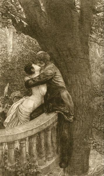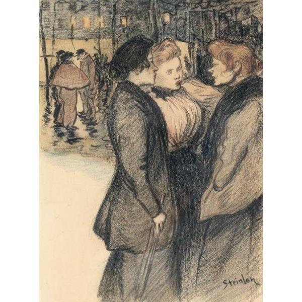Editor: This is “La Chienne Au Loup” by Théophile Alexandre Steinlen, created around 1900, using watercolor and colored pencil. There’s an intimate moment captured in a shadowy landscape... It feels charged with both tenderness and a touch of underlying darkness. How do you interpret this work, especially the title itself? Curator: The title is particularly fascinating, literally "The Dog to the Wolf." We immediately ask ourselves: who is the dog, and who is the wolf? Consider the cultural memory ingrained in those animal symbols. Dogs often represent loyalty, domesticity, while wolves embody wilderness, untamed desires, even danger. Does this kiss suggest a bridging of these two worlds? Perhaps a longing for what seems forbidden or unattainable? Editor: That's a great way to frame it. I hadn’t thought about the duality within the characters. I just saw a loving encounter at first glance. Curator: It's easy to get caught up in the surface. Steinlen’s choices, though, force us to dig deeper. The hazy quality, achieved through watercolor and pencil, adds to the dreamlike atmosphere, obscuring a clear distinction between reality and fantasy. Notice, also, the glow around the embracing figures—almost halo-like. Could this also be interpreted as sacred? Editor: That contrast you've highlighted changes my view of the art entirely. At first it seemed clandestine. But looking at the symbolism, especially the radiant moonlight, it makes me reconsider the emotional and psychological depth of the work. Curator: Precisely. The power of symbols! I initially missed seeing the glow around the figures! I was completely taken in by my memory of dogs and wolves from European fables! Editor: Me too, what a clever title after all!