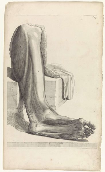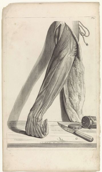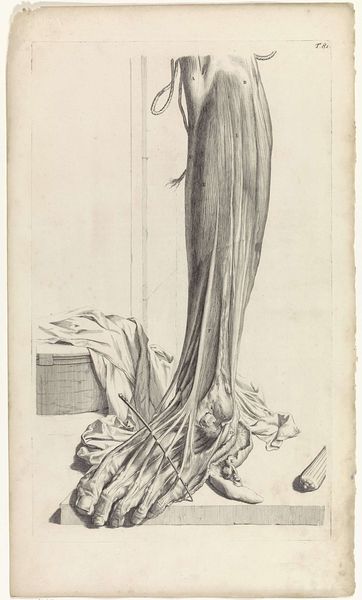 This anatomical study of the bones and muscles of the left thigh was made by Pieter van Gunst, a Dutch printmaker, sometime between 1659 and 1724. At the time, the Dutch Republic was a hub for scientific inquiry, and anatomical illustrations served a crucial role in medical education and research. The detailed rendering of muscles and bone speaks to the burgeoning field of anatomical study and dissection of the human body which developed across Europe at this time. The presence of a book in the picture could be a cultural reference to the importance of academic study and the institutional setting of the anatomical sciences. The image shows the institutional interest in objective and scientific representations of the human body. To understand this image better, we might look at the historical context of Dutch science during the early modern period, the history of European medicine, and the role of anatomical theaters in shaping scientific knowledge. This will reveal how the artistic, scientific, and social contexts intertwine to create meaning.