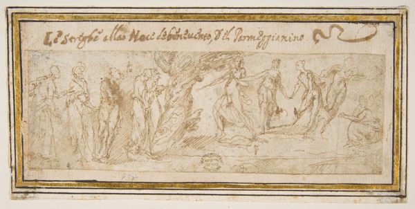 Editor: Here we have Francesco Maria Salvetti's "The Apostles at the Tomb of the Virgin, and Studies for Two Pendentives," created sometime between 1691 and 1758, rendered in ink on paper. It has such a dynamic composition and a sense of almost frantic energy. How do you interpret this work? Curator: The energy you observe resonates deeply with the sociopolitical anxieties of its time. Notice the Baroque style, characterized by its drama and emotional intensity, and the figures clustered together. How might this crowding and dynamism reflect the changing power dynamics of the period? Editor: That's interesting! I hadn't considered the connection to power dynamics. What do you mean? Curator: Well, Baroque art often served as a tool for the Catholic Church to reassert its authority during the Counter-Reformation. How might the artist's depiction of this biblical scene—the apostles at the Virgin's tomb—reinforce specific doctrines and gender roles? Think about the almost theatrical grief. Who gets to express that grief? Who is absent? Editor: I see. The Virgin Mary, the central female figure, is absent from the scene; but so many of the men present express emotion. So, the artwork simultaneously highlights and potentially undermines established power structures through emotional display? Curator: Exactly! Consider also how the "Studies for Two Pendentives" incorporate architectural elements. These suggest the location for this painting: likely a church. The artwork reinforces the institution of the church in complex ways. How does situating religious narratives within specific architectural contexts shape their interpretation and impact on the audience? Editor: It becomes more than just a story, right? It's a lived experience within the sacred space. Curator: Precisely! It encourages the viewer to reflect on art’s capacity to both uphold and question societal norms. Editor: This has given me a richer understanding. Thanks for opening my eyes to how artistic choices are so tightly intertwined with historical context!