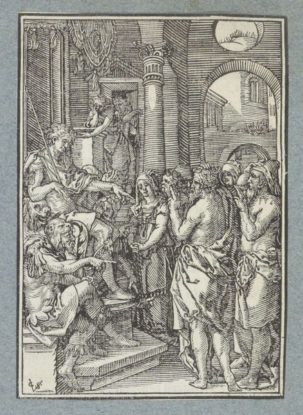 Curator: This is Giulio Bonasone's "Saint Paul Preaching," a striking engraving from around the mid-16th century. Editor: It feels so charged, doesn’t it? All those lines creating this incredible tension, like a gathering storm about to break. Curator: The density of those etched lines certainly contributes to the drama. Bonasone masterfully uses hatching to create volume and shadow, particularly on Paul's robe and the faces of the listeners. Editor: And the composition itself—the oval frame, the strong vertical of the column… it all focuses our gaze directly on Paul’s raised hand, that gesture of authority. Curator: Absolutely. It draws your eye to the heart of the message. There’s a real sense of contained power here, a feeling that something momentous is unfolding. Editor: Seeing it like this, it's much more than just an illustration. It’s a glimpse into a soul on fire, trying to ignite others.