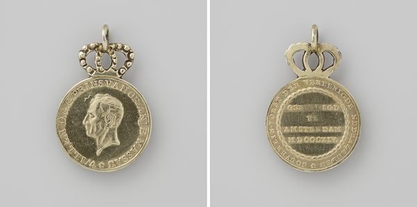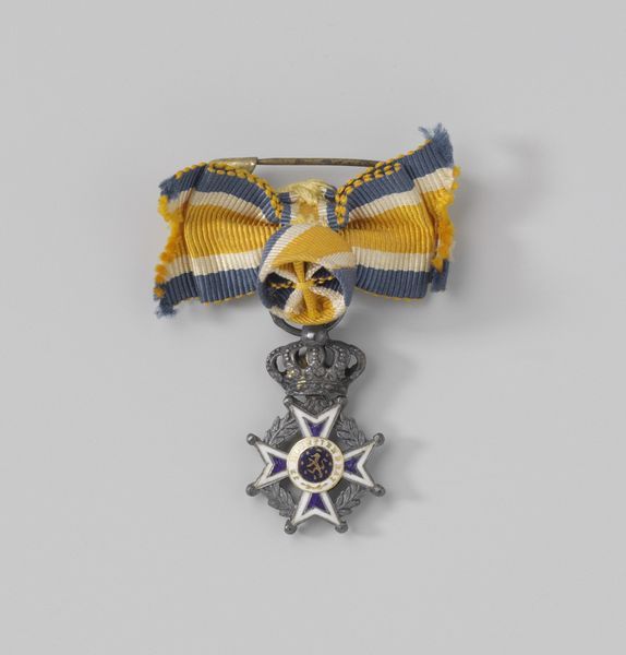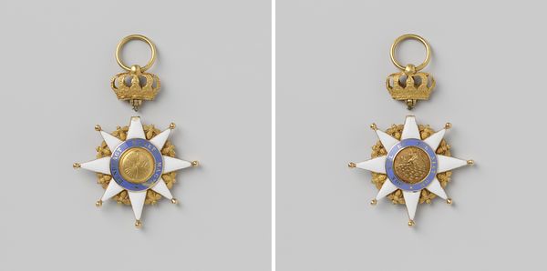 Curator: What a fascinating piece of history we have here, the Orde van de Nederlandse Leeuw, commandeur, crafted between 1838 and 1854 by Petit en van Tongeren. A truly stunning example of decorative art. Editor: It's dazzling, isn't it? Something about the cool precision mixed with that ornate crown makes me feel like I’ve stumbled into a very proper fairy tale. All those crisp, white angles and curls of gold. Curator: Precisely. We are looking at a mixed-media sculpture using metalworking techniques, a testament to the craftsmanship of the period and its embrace of neoclassicism. One can almost feel the labor and precision required to produce these refined details. Editor: Definitely a sense of meticulous hand work here, yes. The weight, literally and figuratively, of authority. It’s interesting to think about how this object functioned – was it displayed, worn, handled with great ceremony? Who was holding it as it was being made? The inscription “Virtus Nobilitat” elevates its symbolism even more, I imagine? Curator: Indeed. Its social function is integral. These awards became tools of social engineering and status reinforcement during the early modern era. And in reference to production, one must recognize the division of labor present, where several workshops and makers, not a sole “artist” contribute to a product. Editor: Yes, “Virtue Ennobles,” rather grand, I find myself wondering about the person who received this specific piece. And considering those collaborative hands... What stories it holds, if it could only speak! It seems a lot to hang on someone's chest, if that's where it went. Curator: These aren’t just ornamental objects, or baubles. They represent the formalization of class distinctions during the transformation to modern capitalism. What some considered as reward was certainly someone's labor, in many instances uncredited and obscured behind the commissioned atelier. Editor: A visual manifestation of power, isn't it? So much meaning packed into that relatively small, shining thing. Reflecting on how something that could easily be seen as 'merely' decorative actually encodes complex layers of social value is incredibly compelling. Curator: Yes, an artifact like this demonstrates that aesthetics are almost always tethered to socio-economic forces and labor, regardless of how refined they seem at first glance. Editor: Well, I certainly won’t look at fancy decorations the same way again. Thanks for shining a light on that, curator.