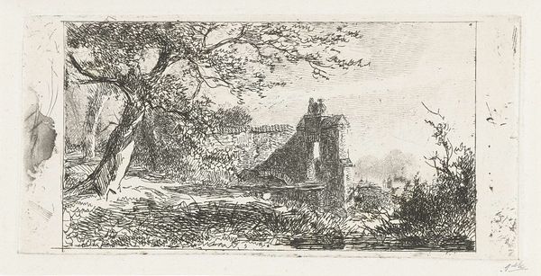 Curator: This is Jan Frederik van Deventer’s "Landschap met poortgebouw," or "Landscape with Gatehouse," dating sometime between 1832 and 1886. It’s rendered using ink in etching and drawing techniques. Editor: My first thought is melancholy. It's small, finely worked, and captures the quiet decay of nature reclaiming a man-made structure. I'm drawn to the texture, how would you describe the use of these materials in this landscape, Curator? Curator: The image immediately evokes the romanticism period. These ruins become potent symbols of temporality and mortality—a popular motif. The artist plays with shadow, using ink to its full potential to explore the balance between light and dark as allegory. Editor: Absolutely, and note how the method accentuates the crumbling quality of the structure. Etching, especially, requires careful application of acid to metal. This landscape feels both intentional and delicate, achieved through painstaking labor. Was Deventer particularly interested in the socio-economic standing related to creating such art pieces? Curator: While detailed biographical information remains scarce, the work does speak to a burgeoning appreciation for 'nature' as it truly exists – flaws and all. The gatehouse isn’t idealized but realistically rendered. This approach may also mirror anxieties relating to rapid industrialization at the time. Editor: Interesting. To me, this isn’t merely about reflecting nature; it’s about human interaction with the land. The etching and ink drawings involved labor, time, and specific tools accessible to certain people. Considering who had the access to materials is interesting when considering landscape art from this period. Curator: A fair point. Thinking about "access" helps us to understand the visual cues too. Observe how the archway acts as a symbolic threshold; perhaps between past and present, or nature and civilization, but we lack the access through it. Editor: Yes, it definitely opens more lines of thought about materiality and social issues! Curator: Indeed. It offers potent, visual evidence about artistic exploration.