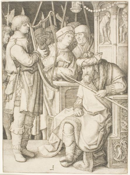 Editor: Here we have a drawing titled "Architect in His Study Holding a Compass and Conversing with Three Men," made with ink. It's attributed to Agostino Tassi and dates from around 1600 to 1700. It strikes me as a rather formal and serious scene, with a distinct air of Renaissance intellectualism. What do you see in this piece? Curator: The architect's compass is crucial, of course. Throughout history, the compass hasn't simply been a tool; it is a potent symbol, one loaded with associations. From antiquity onwards it’s featured as an attribute of divine creators, seen as instruments for establishing order, harmony and, crucially, morality. Even now, can you imagine the echoes such a symbol might have carried? Editor: So it's more than just architectural planning, then. What kind of morality? Curator: Exactly! Think about the period: a period steeped in classical ideals and the humanist belief in humanity's capacity for reason. The compass in the architect’s hand isn't only constructing buildings, it’s building society; drawing, not just lines on parchment, but blueprints for the perfect social order. A perfectable future society in an era beset by conflict. Look at the men around him. They lean in to listen, intently. Editor: That's interesting, given that the architecture in the background is highly ornamented and somewhat chaotic. A vision in need of refinement, perhaps? Curator: Precisely. It could be viewed as both the foundation and the challenge – the current, flawed world needing to be shaped according to divine principles, using both knowledge and the architect's inherent sense of moral and societal vision. It provides a fascinating view of art's cultural role. Editor: That’s given me a completely new perspective on what I first saw! It really highlights how images, like this, accumulate layers of meaning over time.