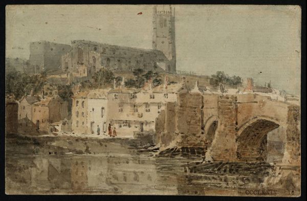 Thomas Girtin's watercolor, "Durham Cathedral and Bridge" presents us with a compelling architectural scene dominated by two powerful symbols: the bridge and the cathedral. The bridge, a physical and symbolic link, suggests connection, transition, and passage. We might recall bridges from antiquity – Roman aqueducts, for instance – that symbolize the empire's reach and engineering prowess. Yet, here, it is intertwined with the spiritual authority of the cathedral. Cathedrals, throughout the medieval period, served not only as religious centers but as beacons of cultural identity, knowledge, and community. Notice how Girtin positions the cathedral atop the hill, its spires reaching skyward, dwarfing the bridge below. This juxtaposition echoes the historical tensions between earthly and divine power, the temporal and the eternal. Consider how, in earlier Byzantine mosaics, Christ is often depicted above earthly figures, signifying his ultimate authority. As we see this cathedral reflected in the water, it further enriches this symbol, as if it is an ever-evolving reflection of collective memory and subconscious belief.