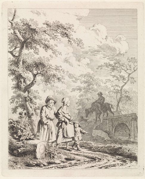 This print, "Two Gentlemen Looking at a Tree," was made by Simon Fokke sometime in the 18th century. It's an etching, meaning that the image was incised into a metal plate, probably copper, and printed with ink onto paper. Consider the labor that went into this small image. An etching like this begins with coating a metal plate with a waxy ground. The artist then uses a sharp needle to draw through the ground, exposing the metal. When the plate is submerged in acid, the drawn lines are etched into the surface. Ink is then applied and the plate is pressed onto paper, transferring the image. The fine, delicate lines you see here are a testament to Fokke's skill. The etching process allowed for detailed rendering of the figures, foliage, and distant landscape. It's a reminder that even seemingly simple images are the result of skilled handwork, connecting the world of fine art to the broader realm of craft and industry.