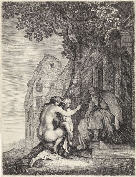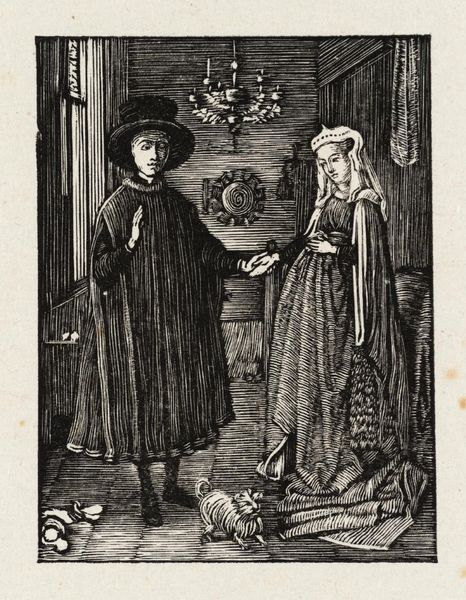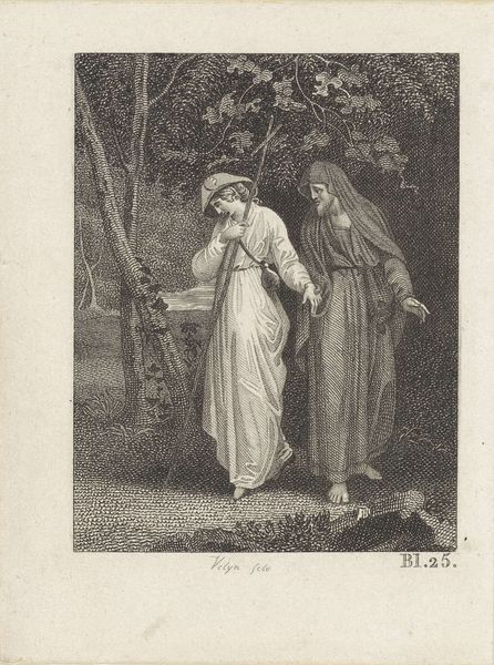 Curator: The Tate holds this intriguing engraving, "The Merry Wives of Windsor," after Sir John Gilbert, masterfully executed by the Dalziel Brothers. It presents an intimate encounter. Editor: My first impression is one of secretive anticipation. The figures are framed by lush foliage, suggesting a hidden rendezvous. It's all in the balance of light and shadow. Curator: Indeed. The Dalziel Brothers' role as engravers highlights the Victorian print industry's impact on disseminating art and literature to a wider public, influencing societal values. Editor: The composition is fascinating; the spiral column creates a visual anchor, drawing the eye upwards. The detailed line work and contrast serve to elevate the scene. Curator: Gilbert’s focus on storytelling here connects to the era’s emphasis on moral narratives and domestic dramas, revealing the social expectations placed upon women at the time. Editor: True. It really evokes a sense of hushed conspiracy, amplified by the meticulous rendering of textures—clothing, foliage, architectural elements. A tiny stage for a drama. Curator: Considering the materials and collaborative process reveals the complexities of art production and its reflection of Victorian social norms. Editor: And the visual language employed really drives that point home. A true reflection of that period.