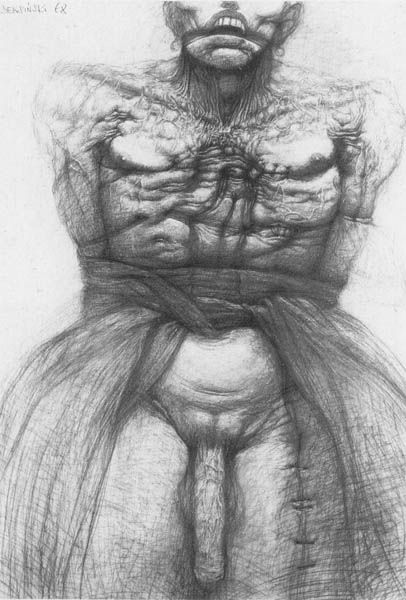 Editor: This untitled drawing is by Zdzislaw Beksinski and appears to be created with charcoal and pastel. It's incredibly unsettling. The figure is distorted and shrouded, yet also disturbingly intimate. How do you interpret this work? Curator: Beksinski's art powerfully explores the intersection of body politics and societal anxieties. The distorted, almost tortured figure confronts traditional beauty standards, demanding a re-evaluation of the female form. Note the ways the artist renders flesh, simultaneously eroticized and grotesque, which could be read as a critique of the male gaze and its inherent violence. How does the subject’s obscured face impact your reading? Editor: It definitely adds to the feeling of unease and hints at censorship, maybe even a forced silence. I am just now seeing a kind of gaged appearance to the eyes... Curator: Precisely. The covered face raises questions about the suppression of identity, specifically of the female body. Given Beksinski's cultural background, this suppression of identity becomes especially poignant. What specific societal structures do you think this artwork responds to? Editor: I’d say it challenges patriarchal control, especially in its blatant depiction of sexualization and degradation. Curator: Yes, exactly. It uses disturbing imagery to reflect societal traumas and the struggle for self-expression and liberation. Editor: I see it. Thanks for opening my eyes to those layers! Curator: And thank you for your insights. It’s a chilling work that forces us to confront uncomfortable truths about power, objectification, and the female experience.