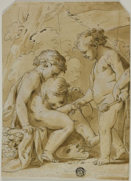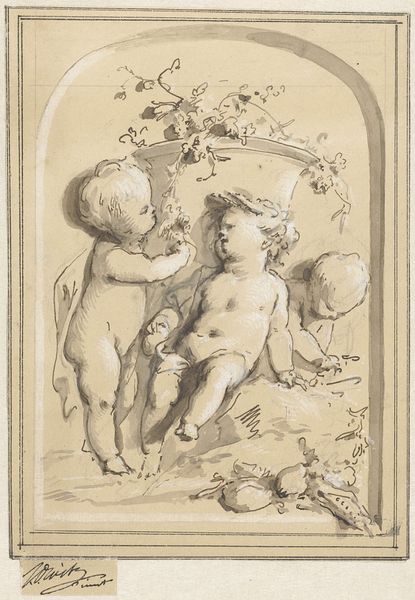 Curator: What a delightful scene! We’re looking at an 18th-century drawing from the Rijksmuseum attributed to Bernhard Schreuder: "Four Putti Picking Grapes near a Vase." It's rendered in ink, displaying a landscape-style genre painting, typical of the Rococo era. Editor: My first thought is "joyful." The plump little figures seem to be having the best time, a real celebration of childhood abundance. Curator: Absolutely. The putti themselves are fascinating symbols, carrying so much art historical weight. They tap into a tradition stretching back to antiquity, representing playful innocence, even divine love and protection. You see them used decoratively across Roman sarcophagi. Editor: Yes, and by the time Schreuder created this, putti were thoroughly intertwined with depictions of earthly delights, echoing themes found in aristocratic garden parties, country feasts, and general expressions of privileged relaxation that prevailed in that era. Curator: Precisely! Think of grape harvesting, and Bacchus, and you have the intoxicating blend of pagan joy and artistic license. Notice the vase as a container--almost like a classical echo itself--that also carries that fruitfulness from ancient history onward. Editor: I notice it’s a drawing. Ink work like this often functioned as preliminary studies. How might something like this have played out in the Dutch art market, though? Did it primarily appeal to collectors as independent pieces, or would artists use these kinds of drawings to court patronage or workshop commissions? Curator: Great question. In 18th century Netherlands, detailed drawings such as this served multiple functions. Wealthy art enthusiasts increasingly prized them for their own collections. Simultaneously, this artistic demonstration could very well operate to acquire lucrative decorative commissions or signal the painter's qualifications. The skill apparent in its subtle gradations surely had a social purpose beyond art alone. Editor: Well, viewing this delightful scene has me reflecting on how consistent are artistic cravings through history! A snapshot of cherubic frivolity--whether carved in marble or dashed in ink, these symbolic yearnings don't change much after all. Curator: A wonderful reminder that these cultural longings, captured by Schreuder's ink, carry profound psychological echoes still.