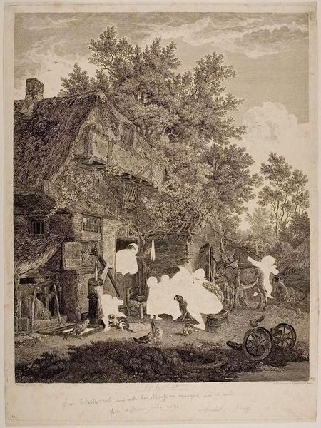 Curator: Well, this scene is brimming with daily life; it has a rather pleasant atmosphere despite the obviously grueling work! Editor: Yes, I'd agree, a deceptively romantic vision. It reminds me of those antique music boxes that reveal an idyllic tableau when opened, concealing the mechanism with gears hidden inside. It feels self-contained, peaceful somehow. Curator: Here, we have “Flemish Peasant Family,” believed to be rendered sometime between 1637 and 1664, by Thomas van Apshoven, using oil paint. Today, the work finds its home at the SMK, Statens Museum for Kunst. The realism within really jumps out. Editor: The chickens milling around! It's as if life cannot be contained within a single frame, but spills outwards into reality. All these small elements lend it an everyday sort of charm. Are the animals simply there or symbols within the narrative? Curator: Likely both! This piece draws upon the visual language of genre painting while reflecting Dutch Golden Age and Baroque sensibilities. Everyday life rendered monumental, almost heroic. The repetition of similar domestic settings really solidified shared identity. What strikes me is not just what the image reveals, but how these elements weave into our own understanding of their cultural context, which has continued, informing later artists. The symbols used in Dutch art carry great emotional and social weight, persisting into modern iconography! Editor: Indeed. Even today, the image of farm and home is used to evoke an old idea. It goes to show that Apshoven created this image within its contemporary context but in so doing inadvertently cemented its enduring relevance. And it leaves me thinking... Curator: It also illustrates an interest in depicting not only what one sees, but capturing what those observations reflect back onto the individual; history folding back in on itself. Editor: Fascinating, a loop in time revealed through one image, of daily life. I appreciate your insight; that’s certainly given me plenty to contemplate!