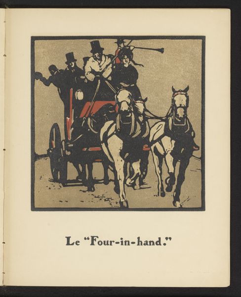 William Nicholson created this print, "Jockey en Roeiers," using woodcut techniques during a period when printmaking was gaining traction as both a fine art and a medium for social commentary. Nicholson, working within the context of late 19th and early 20th-century British society, a time marked by rigid class structures and burgeoning artistic experimentation, offers us a glimpse into the leisure activities of the well-to-do. The image presents a scene of equestrian sport, perhaps alluding to the privileged sphere of horse racing. The jockey, an almost anonymous figure, is depicted as a silhouette, reducing him to an emblem of his class and profession. The artwork subtly questions the hierarchies of labor and leisure, hinting at the social divisions that underpin such displays of wealth and recreation. Nicholson’s choice of the woodcut, a medium often associated with folk art, complicates the narrative by infusing the scene of upper-class leisure with a touch of democratic sensibility. The print invites us to consider the dynamics of spectatorship and participation in a society where access to leisure was far from universal.
